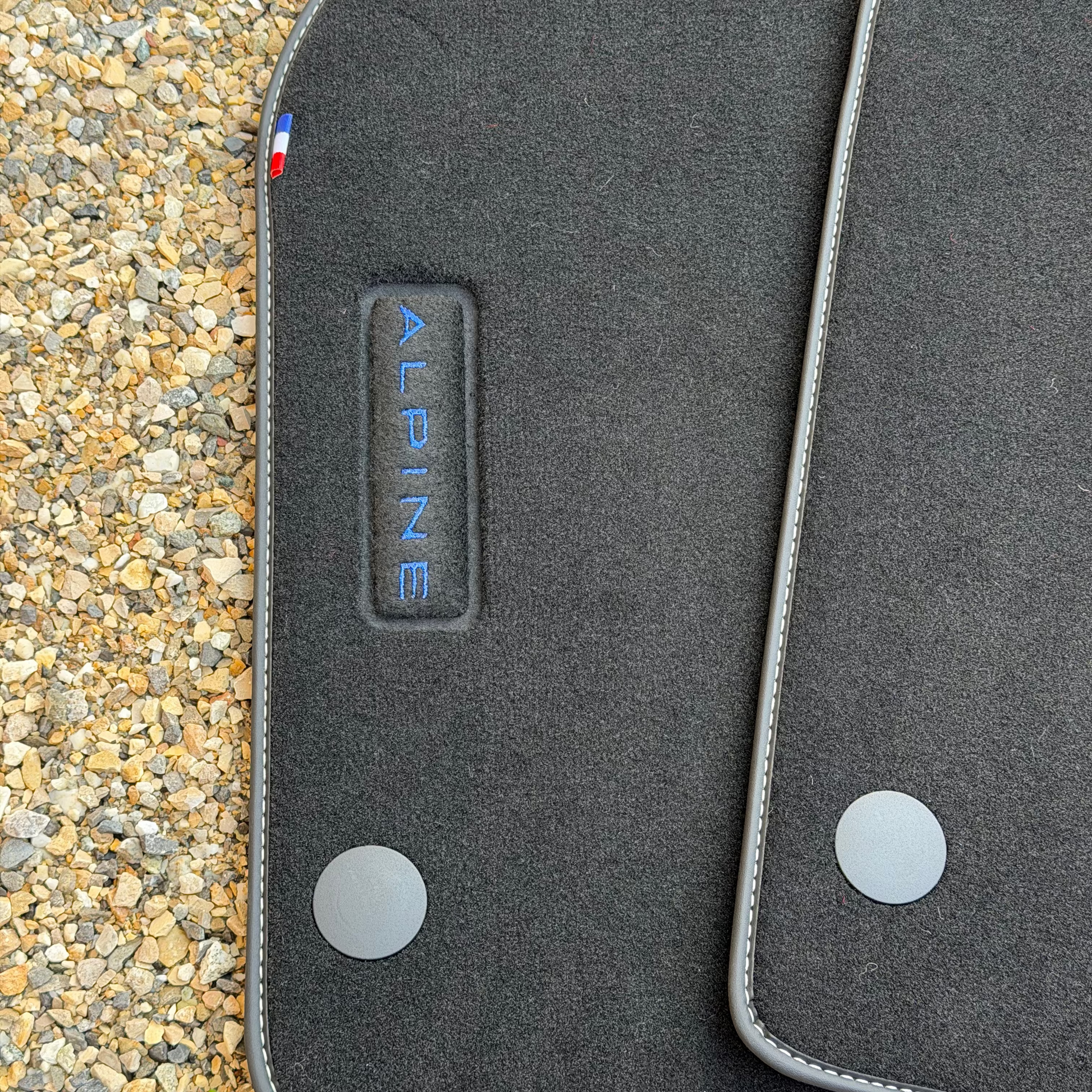 Lot de 2 tapis avec broderie "ALPINE" pour tous les modèles Alpine A110 by JOYAUTO. Compatible pour TOUS les modèles A110 (Pure,GT,GTS,Légende,S,R,...)